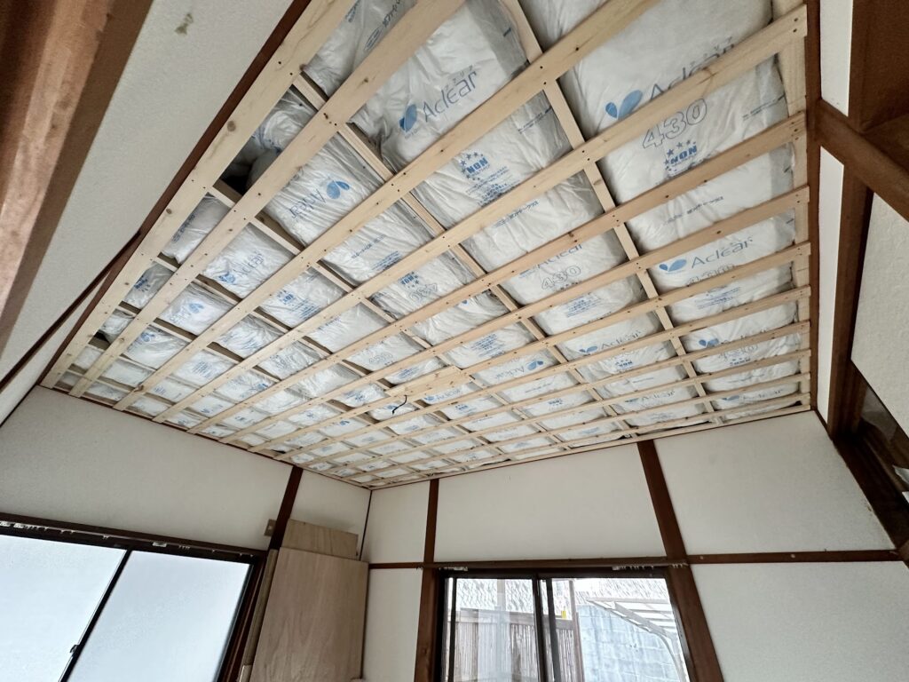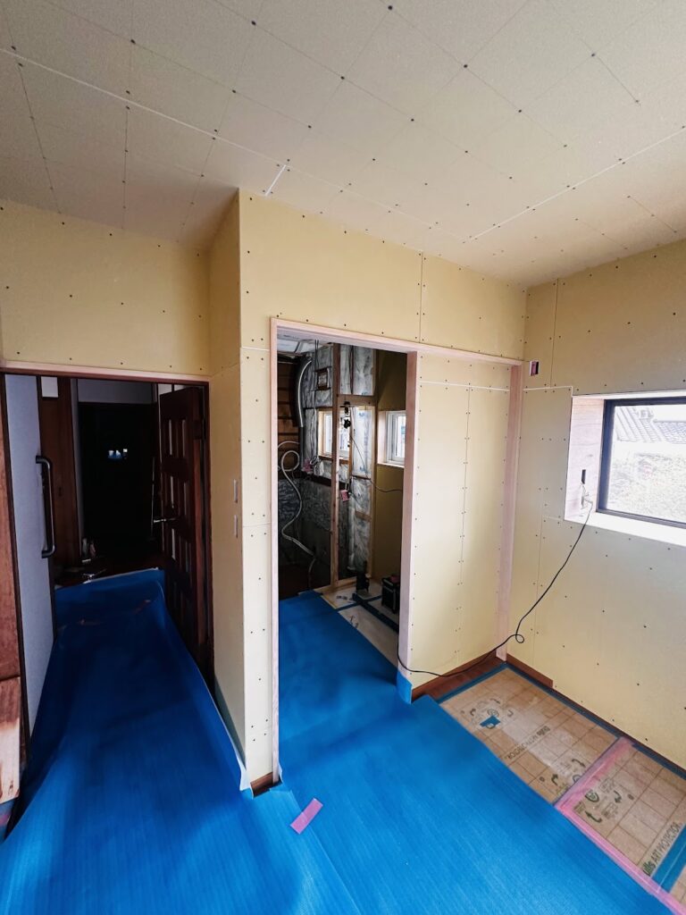 クロス用下地板”プラスターボード”を張っています。もちろん壁にも断熱材を入れています。