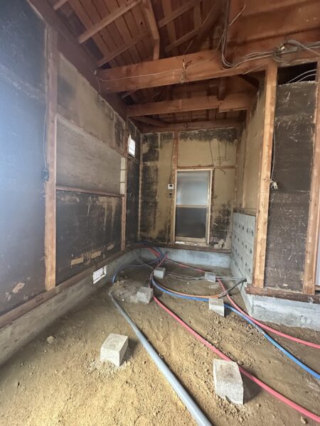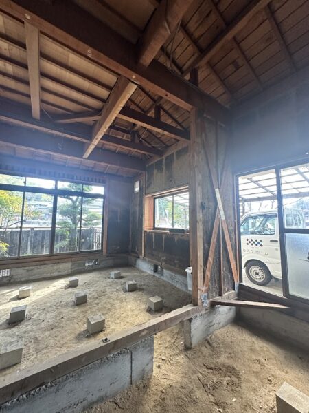 キッチンとリビングスペースを解体した後の写真です。土台や床を支える束石がきれいに残っていました。構造上解体できない壁は残しています。
