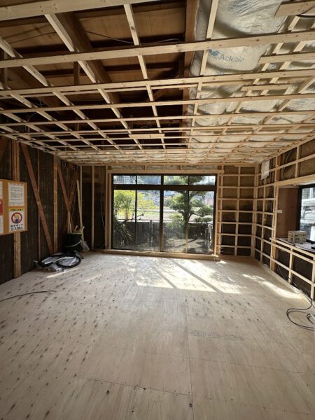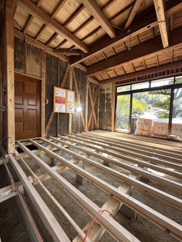 大工さんが床をつくっている途中です。この上に断熱材と下地、フローリングを貼っていきます。