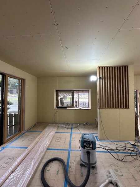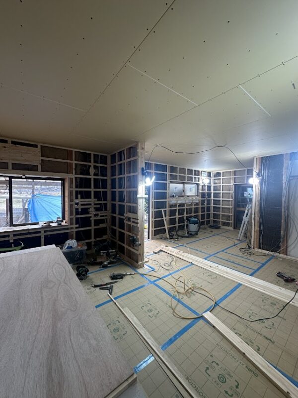 床の下地まで貼り終え天井にも断熱材を入れていきます。