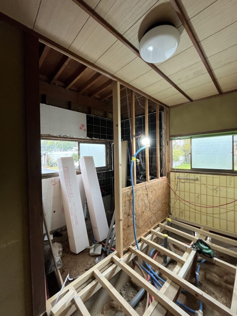 浴室と洗面所の境の壁は完全に傷んでいたのでやり替えました。 洗面所の床もしっかり下地を組みなおしています。