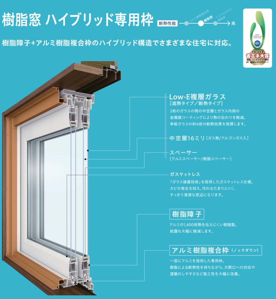ハイブリッド専用枠とは、『屋内は樹脂枠』・『屋外はアルミ枠』とそれぞれ違う素材で構成している枠です。