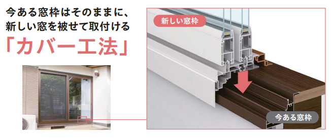 既存枠に被せる形になるので工期も短くなり、空気の出入りを防ぎ、より高い断熱性・気密性も実現しています。