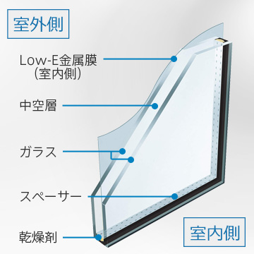 2枚のガラスの間に、熱の伝わりを抑える「Low-E膜」という特殊な金属膜をコーティングした、高い断熱性と遮熱性を両立したガラスです。