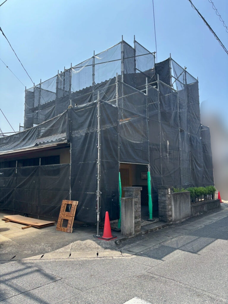 安全に作業できるよう足場を設置します。メッシュシートで囲むことで塗料等の飛び散りを防ぎます。