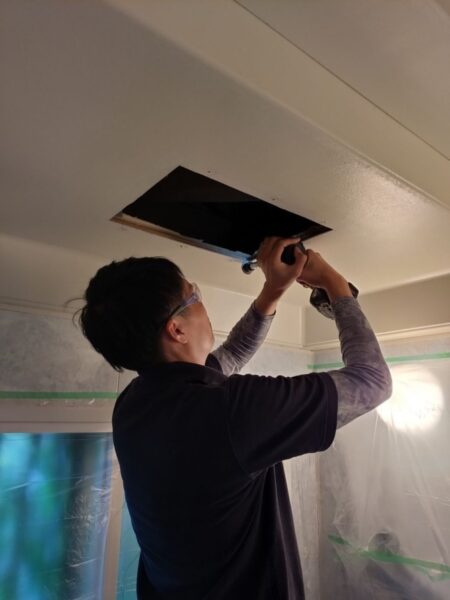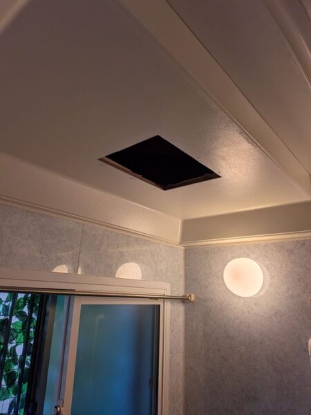 開口サイズが少し小さかった為、新しく付ける浴室暖房機の為にカットしています。