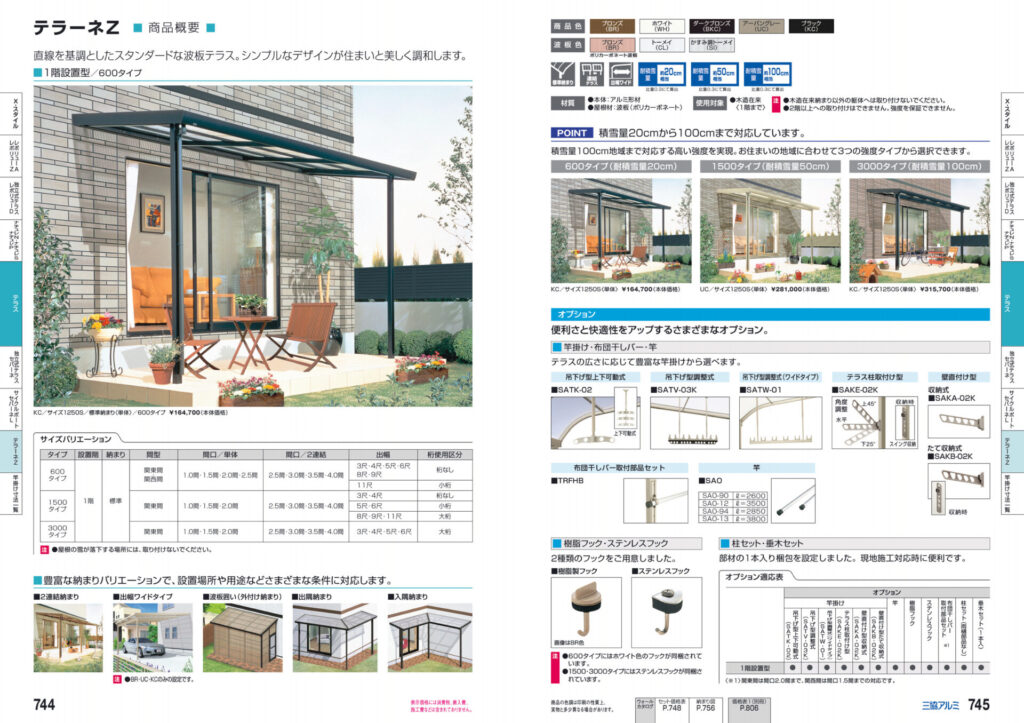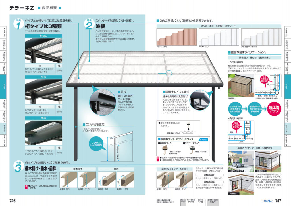 今回は三協立山アルミの「テラーネZ」を選定しました。 直線を基調とした波板テラスで、柱2本のスッキリとした見た目になります。サイズやカラーバリエーションも多く、より高い機能性を備えたモデルになります。