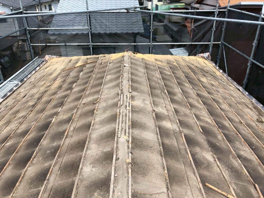 既存のセメント瓦をすべて撤去した直後の屋根下地の状況です