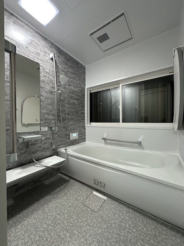 ユニットバス組み立て後です。 ※既存窓の手前にユニットバス用の窓枠を設置するため、両サイドの窓引手部分は枠で隠れてしまいます。