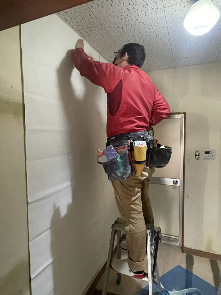 既存クロスを取り外します。パテで凹凸を補修するので、乾燥する時間が必要になります。
