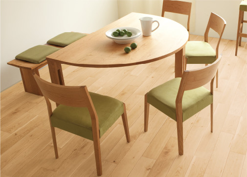 【銘木フロアーラスティック】 今回はナラ樫を使用しました。 重量感があり、耐久性や耐水性に優れている材です。 木目は存在感があり、様々な雰囲気の部屋に馴染みやすく、色合いは年月とともにやわらかい黄金色へと変化します。