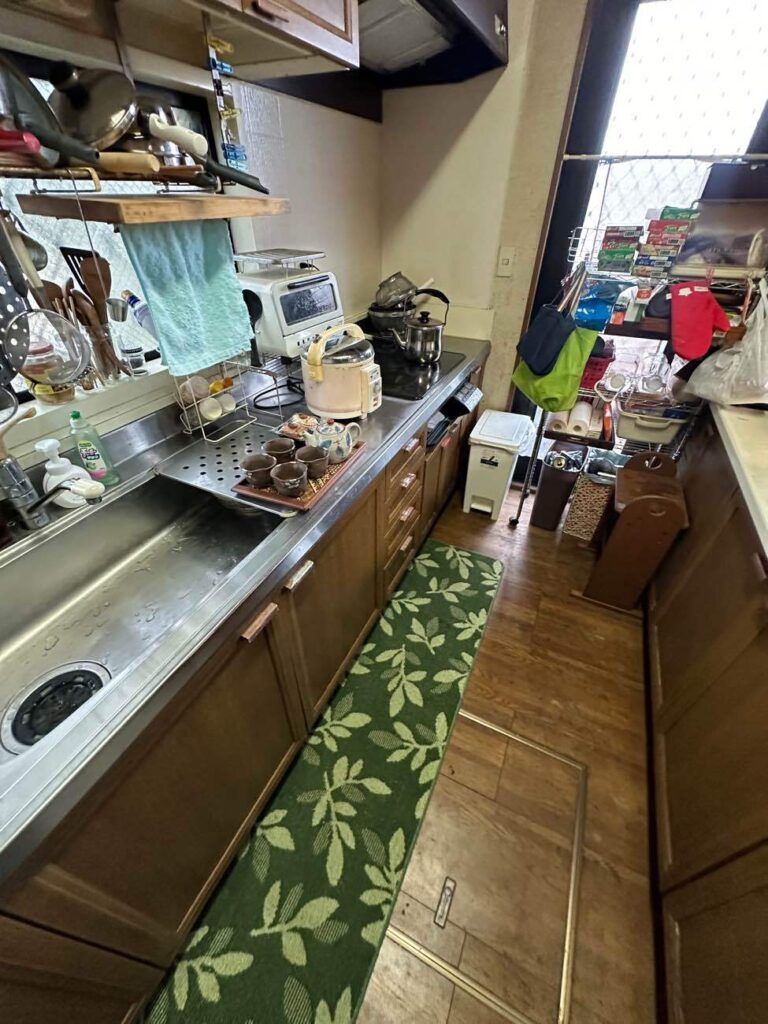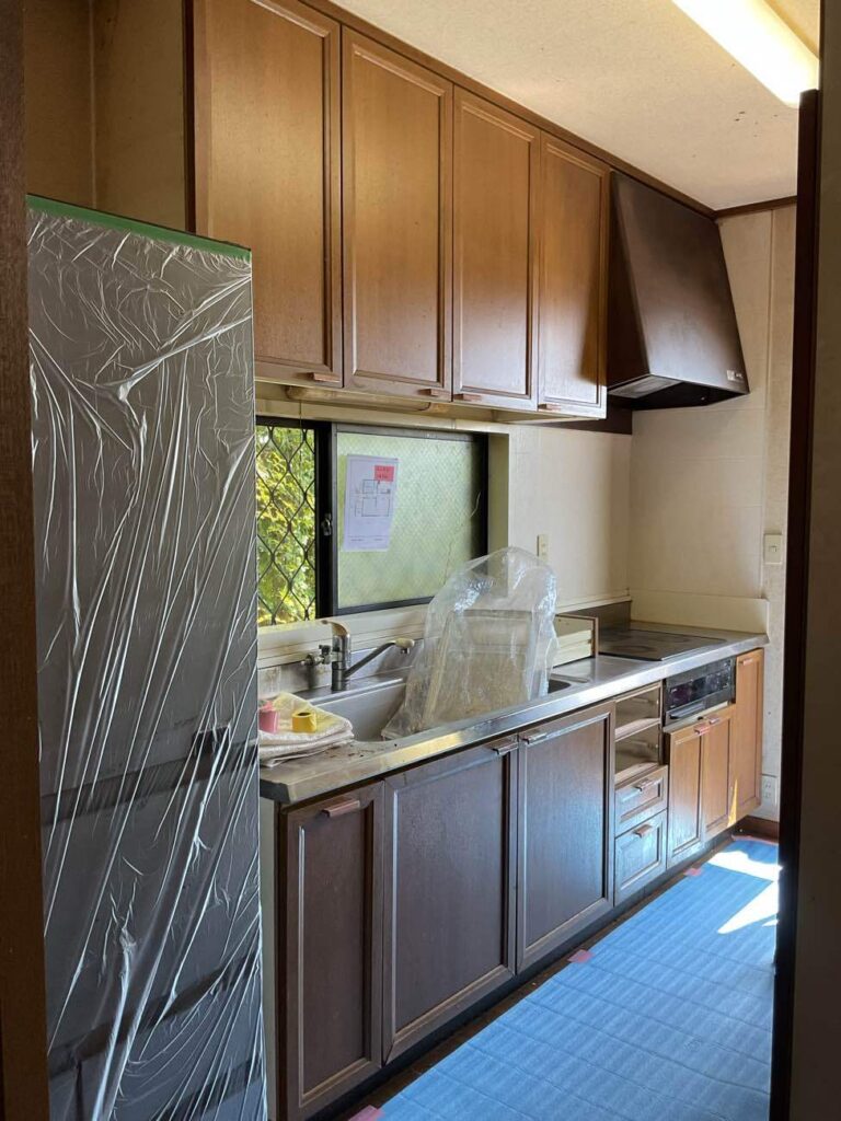 既存のキッチンです。このキッチンや、向かいにあるカップボード・壁を解体していきます。