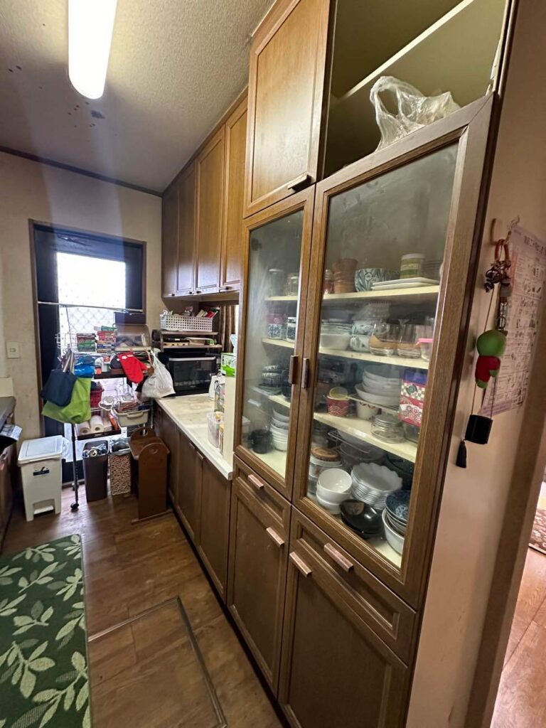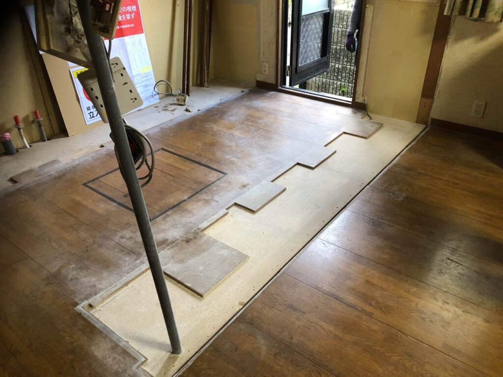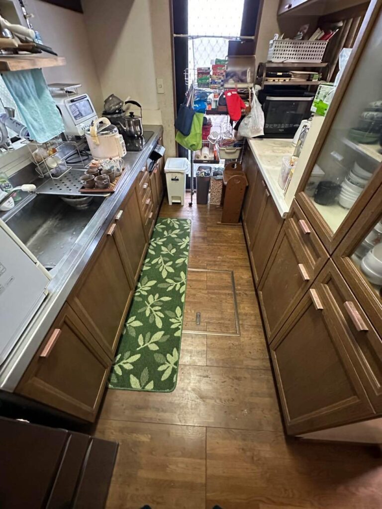 キッチンの向かいのカップボード・壁の解体後です。カップボードや壁に沿ってフローリングが切り取られています。