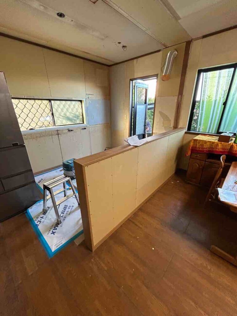 対面風キッチンに仕上げるため、カウンターを立ち上げました。この後、クロスをカウンターやキッチンに貼り、キッチンを設置したら完成です。
