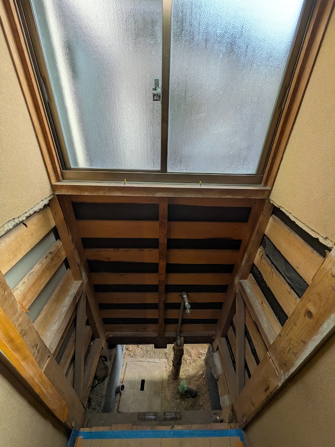 解体後の様子です。 既存の化粧台の下台で床が塞がっていただけなので、撤去後は床が無い状況でした。