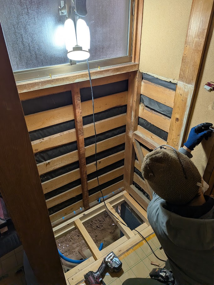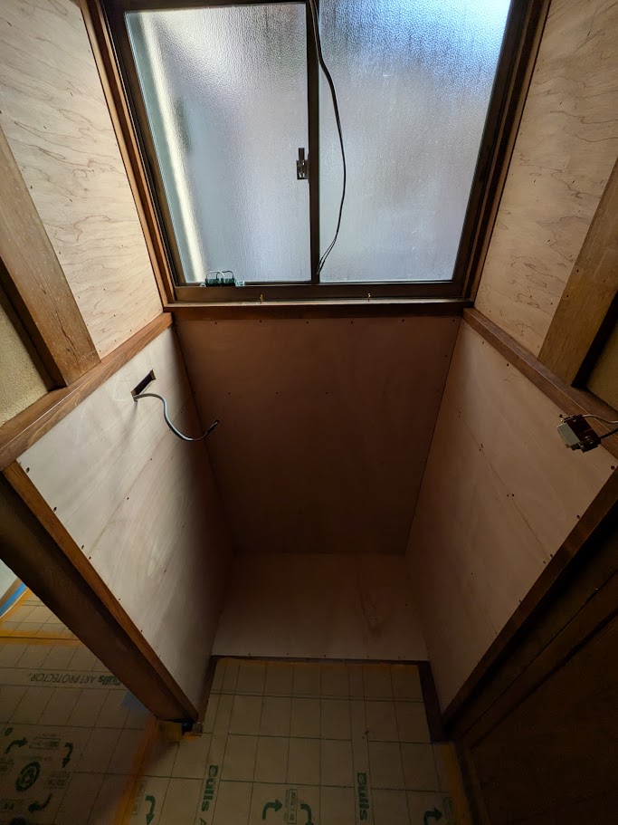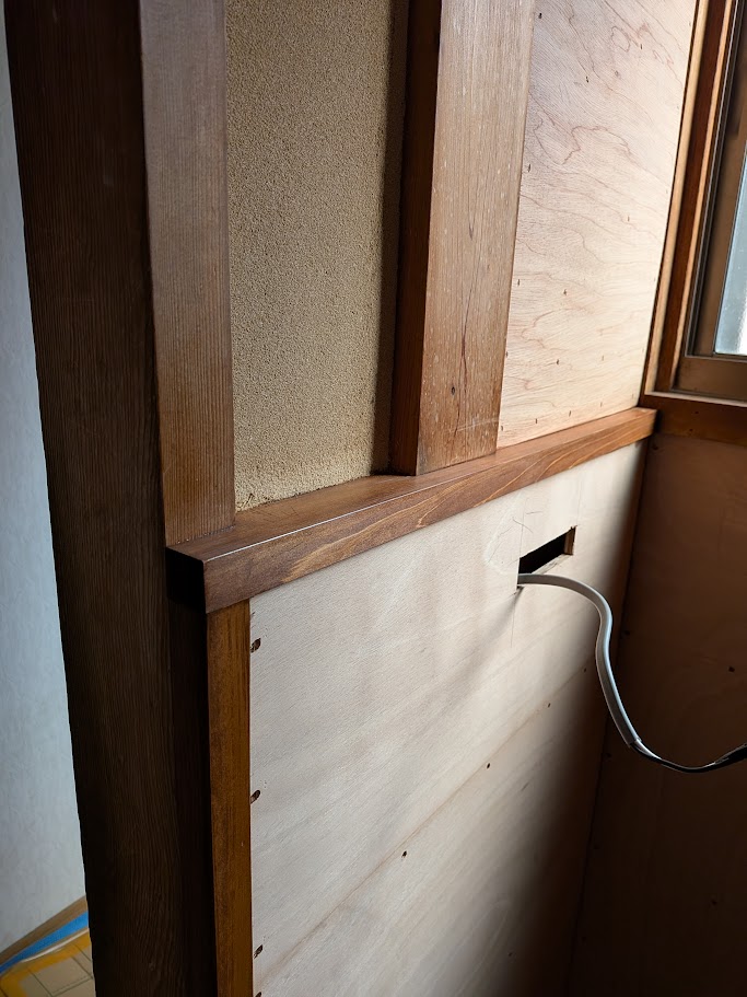 土壁の部分にも薄いベニヤ板を貼って、クロスが貼れるように下地を作りました。