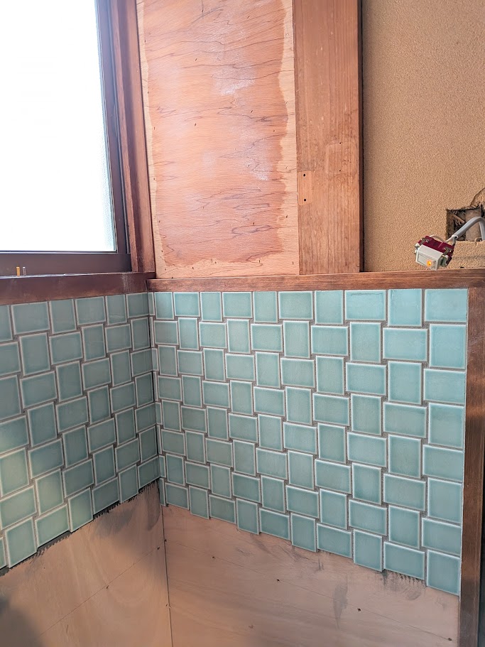 設備を取り付ける前にタイルを貼ります。目地は少しグレーがかったものを選定しました。タイルと周りの木との相性が抜群です!!