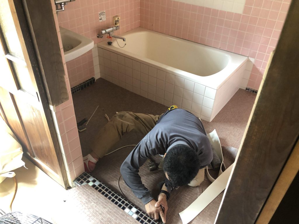 浴槽と、その周辺部タイル壁を解体し、新しい浴槽を入れるための下地をします。