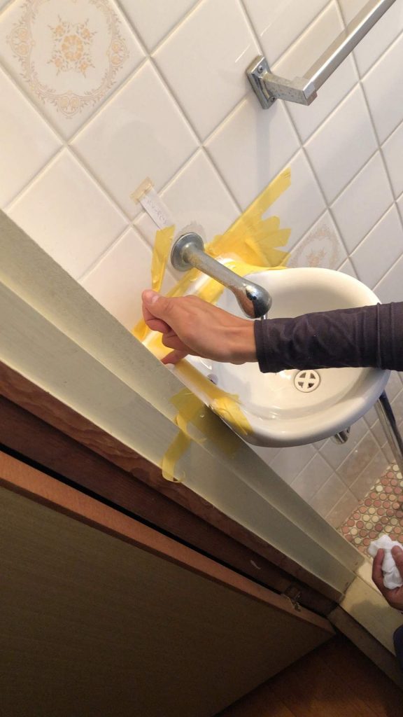 陶器部分の交換後コーキングを打っていきます。