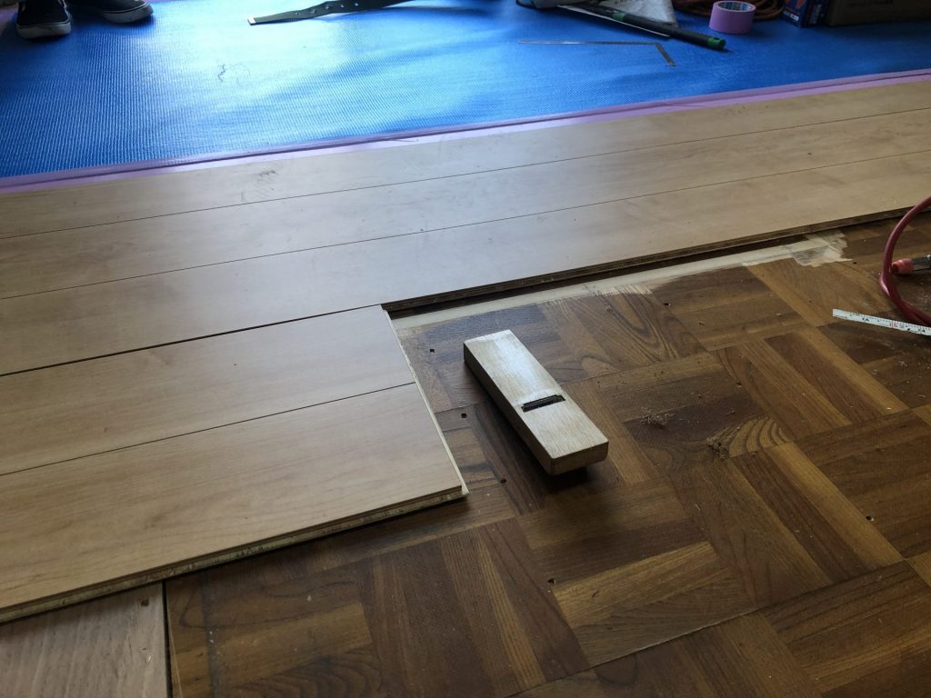 上からフローリングを貼っていきます。既存床にそのまま重ね張りしますので強度も上がりかつ、余計な解体ガラも出ません。