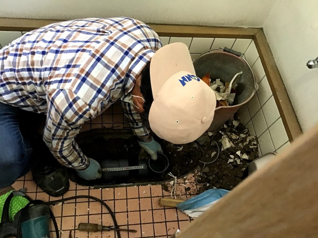 元々あった便器の周りのみ床を解体をして新しい排便管を新設する工事をしています。