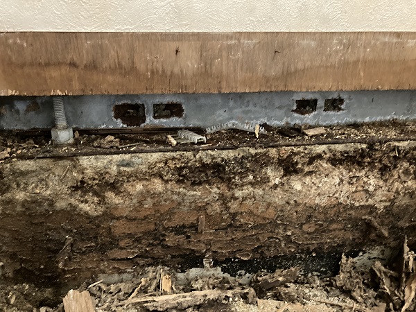 トイレの床の沈みの隙間から、鉄部に錆があることが分かりました。外壁から壁を伝って内部に水漏れしていたことが推測できます。 -