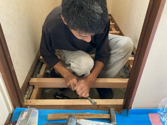 雨漏り補修工事の次に、トイレの床の沈みと段差を解消するために、元々貼られているクッションフロアを剥がし、根太や大引きといった床の下地部分も解体しました。 -