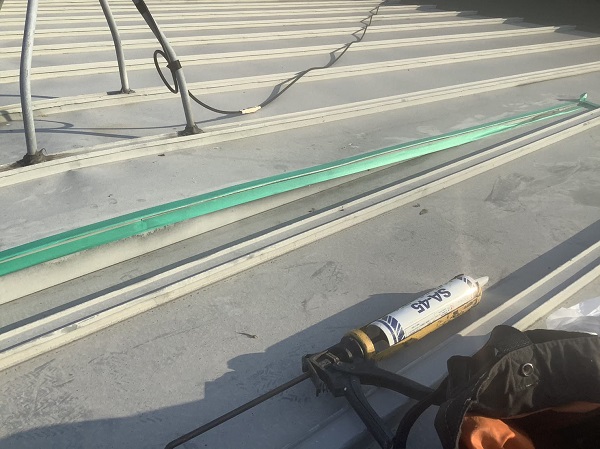 最後に、わずかな隙間が見受けられた軒違い部分(外側に出っ張って突き出ているところ)に、屋根・外壁用として一般的に使用される変性シリコン系のコーキング材を打ちました。仕上がりをキレイにするため、打つ前にマスキングを行います。