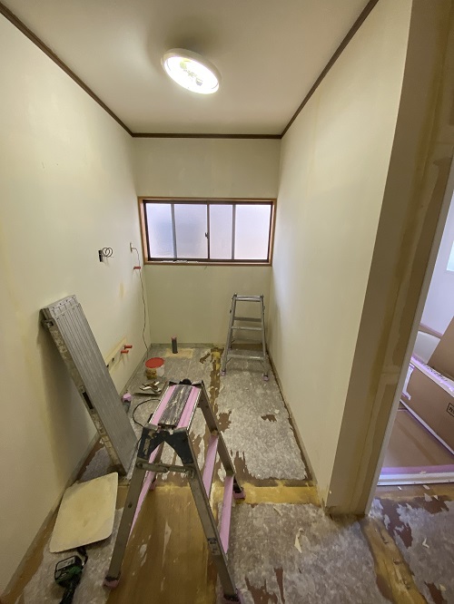 既存の壁紙関係を剥がしていきます。そのあと排水周りの床を塞いでいきます。