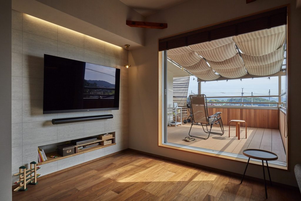 ご主人念願のセカンドリビング。主にお施主様世帯がくつろぐ空間です。セカンドリビングとテラスをつなげ一体感のある空間として使用できるよう設計。テラスからの眺めはご主人が昔から好きだった景色をぜいたくに満喫できるようになりました。テラスではバーベキューをしたり、映画を見たり・・・。ご主人は星を見ながら、うたたねをしてしまうこともあるほどリラックスしているそう。