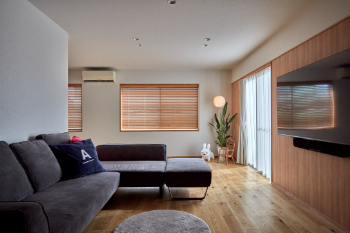 リビングは大きなソファを置いてもゆとりのある広さ。程よい距離感でくつろぐことができます。また壁に木目調のクロスを使用し、柔らかく温かい雰囲気を演出。奥様のお気に入りの照明が映えます。