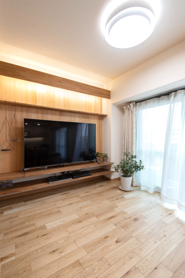 「木の温もりを感じられるLDKにしたい」というご要望をもとに、床は突板フロア、テレビ台背面やキッチン腰板には羽目板を使用し、温かみのある空間となりました。