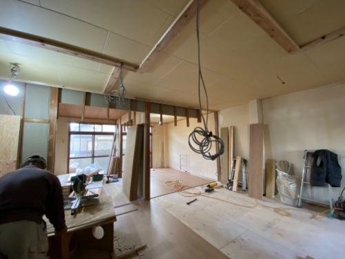 大工が間取り変更に伴い壁や天井を作っていきます。
