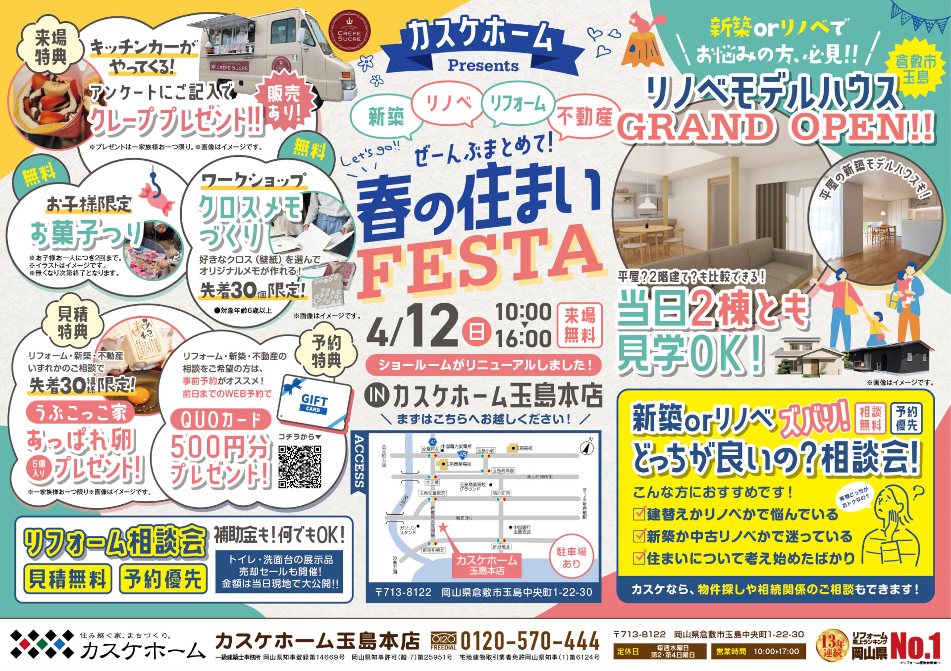 リニューアルして生まれ変わった、カスケホーム玉島本店にて春の住まいFESTAを開催いたします。
