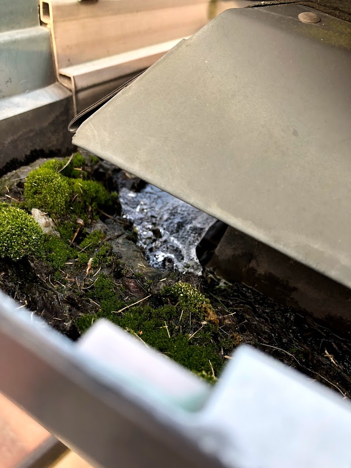 樋が土や苔で詰まって水が流れにくくなっており、溜まった水が寒さで凍っていました。