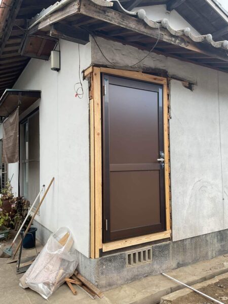 今回はせっかくなら物干しスペースにしたいとのことだったので、ウッドデッキなどを設置することを見越してドアを設置し、周辺を壁にする処理をしていきます。