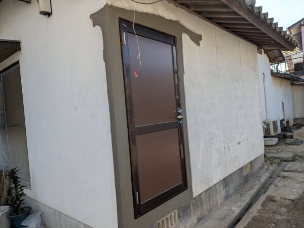 ドア周辺の木部分が周りの壁となじむようにするため、モルタルを塗りました。