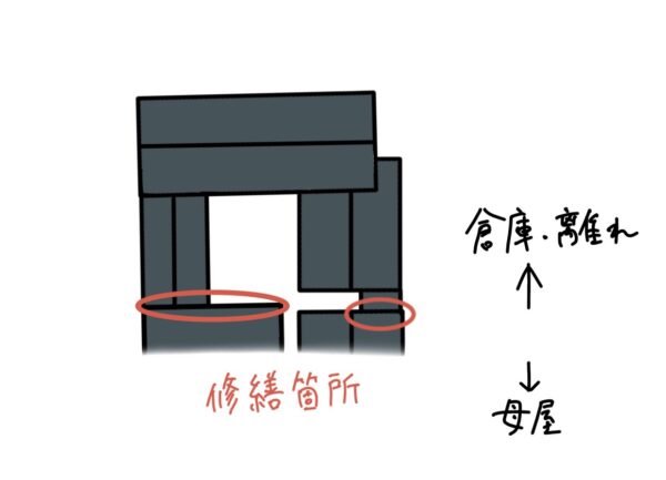 今回は修繕箇所の右側、廊下と外壁の補修の工事の内容をお届けします