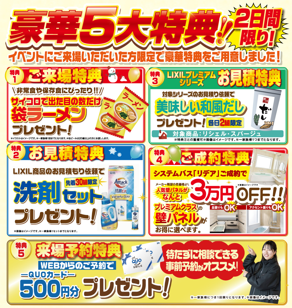 来場特典やお見積もり特典、ご成約特典など沢山の特典もご用意しております!