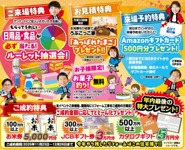 ご来場特典・お見積り特典・予約特典などなど、、様々な特典があります。