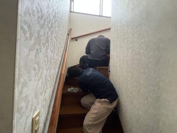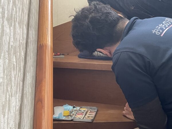 施主様がエアコンの交換を他社に依頼した際に、誤って部材が階段に落ちて傷が付いたとのことで、修繕してほしいという御相談でした。