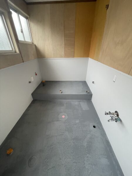床の防水塗装もまだ1度塗っただけですので、さらに2度塗装致します!