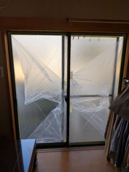 貼り替え中はお家の中が見えないようにビニールで目隠しをさせていただきました。
