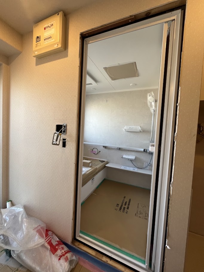 お風呂本体が組み上がった次に行うのは、「入口の枠取り付け」と「脱衣所の内装貼り替え」です!