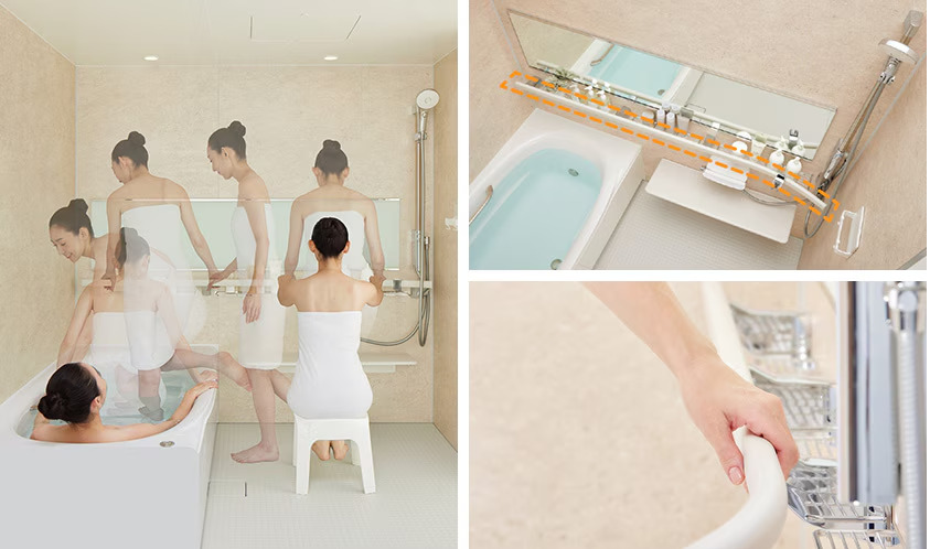 浴槽への移動もスムーズに 洗い場から浴槽へ移動する際、バーがガイド(エスコート)してくれるので、滑りやすい浴室でも常に安定した姿勢を保てます。
