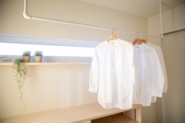 室内物干し(ホスクリーン等)の設置: 天井に取り付けるタイプの物干しなら、使わない時はスッキリ収納。