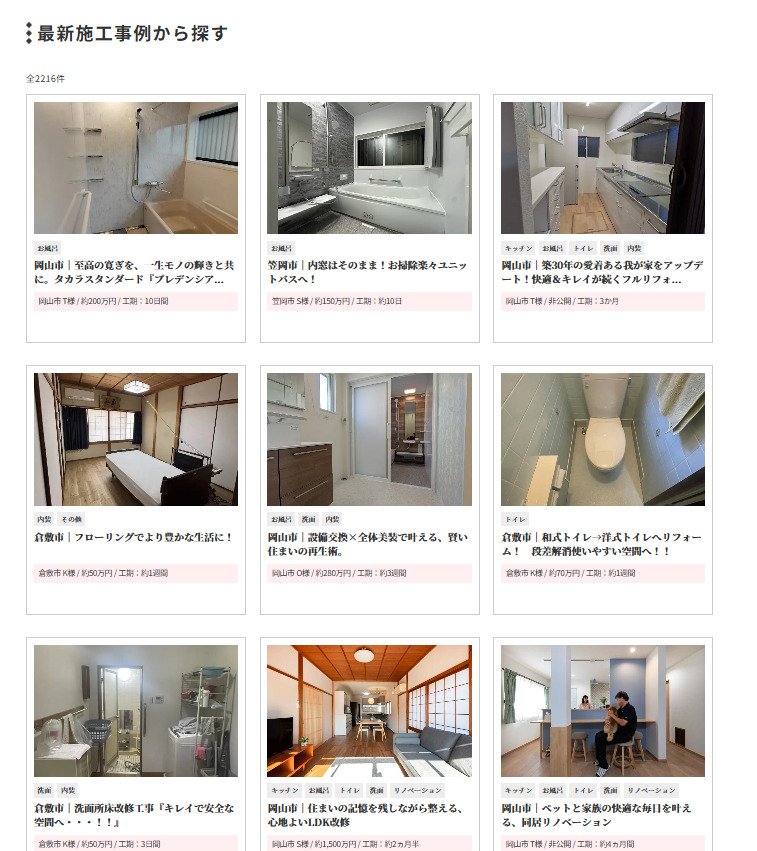 最新の施工事例から「キッチン」「外壁」など気になるジャンルを選択してご覧いただけるようになっています!