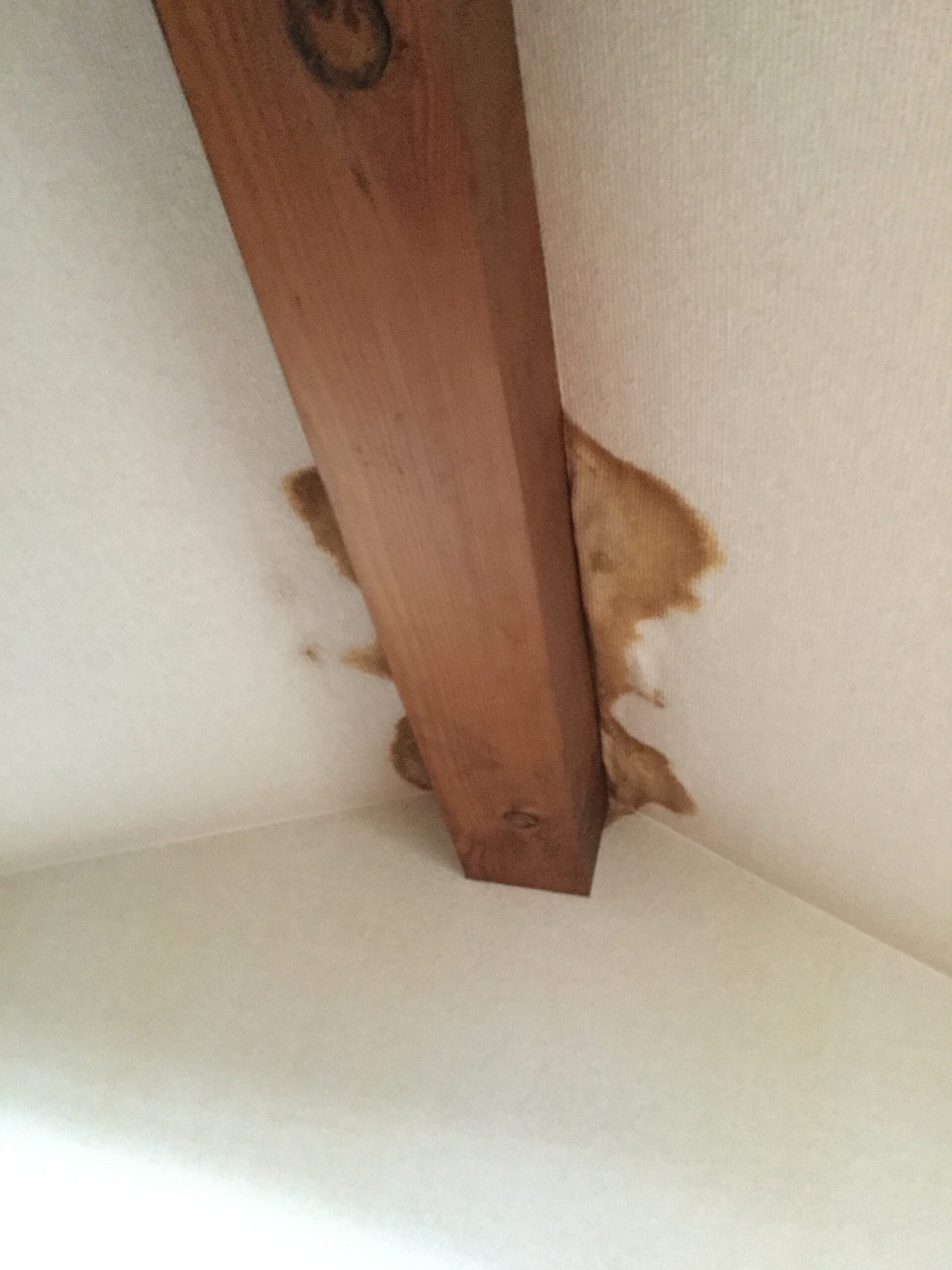 ん?近くを見ても雨が漏れてそうな原因がわかりません。。もしやと思い近くに行くと異臭が。。。原因はコウモリの排泄でした。