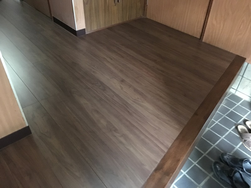 玄関上がりがけのところ、框の部分は木口が見えるので、L字に木を加工して、塗装をしています。