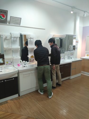 新しい洗面化粧台の展示品を取り付けていたのは、アドバイザーの三宅&岩川。